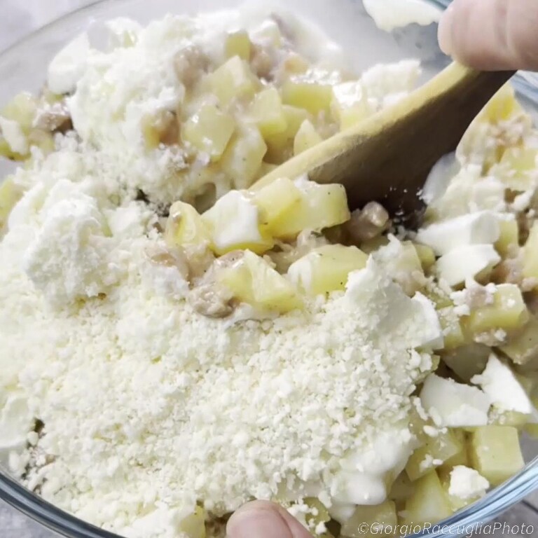 The base of this recipe consists of layers of al dente cooked pasta, enriched with potatoes and succulent sausage. The sausage, with its savory and enveloping taste, gives a meaty and robust note to the dish, creating a perfect balance with the sweetness of the potatoes and the softness of the pasta. The final touch that completes this tasty preparation is the béchamel, a creamy sauce made of milk, butter, and flour.
