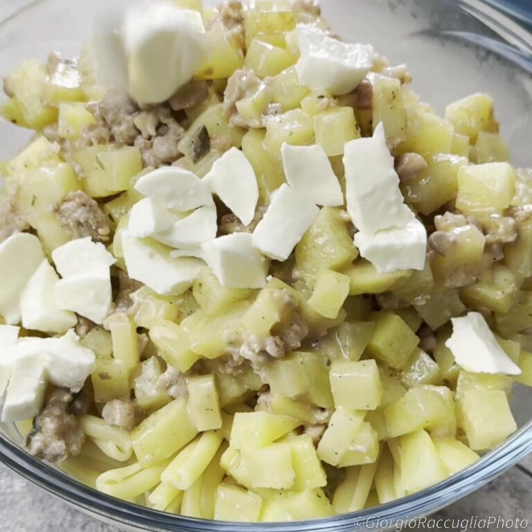 Drain the pasta a few minutes before the time indicated on the package and transfer it to a large enough bowl. Add the potato and sausage mixture,