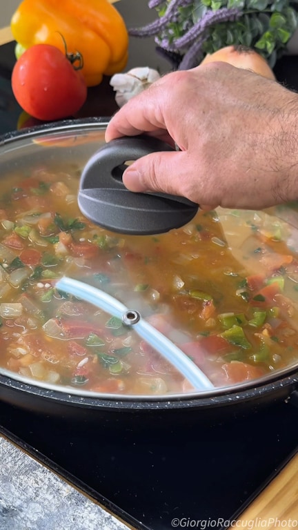 In the meantime, wash the small peppers, cut the top off and remove the seeds and internal filaments.