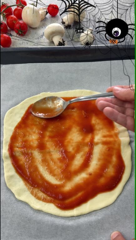 Now move on to assembling the pizza: spread 2 tablespoons of tomato sauce, already seasoned with salt and extra virgin olive oil, on the pizza base.