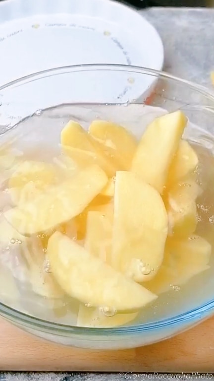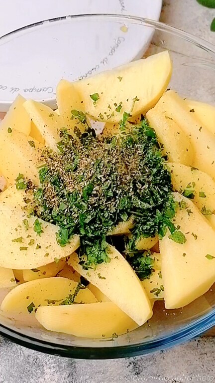 The oven-baked potatoes, covered by a thin golden crust, present themselves as little treasures of goodness. The carefully prepared bacon contributes to creating a crispy surface that beautifully contrasts with the softness of the potatoes. The result is a union of textures that blend harmoniously in every bite.