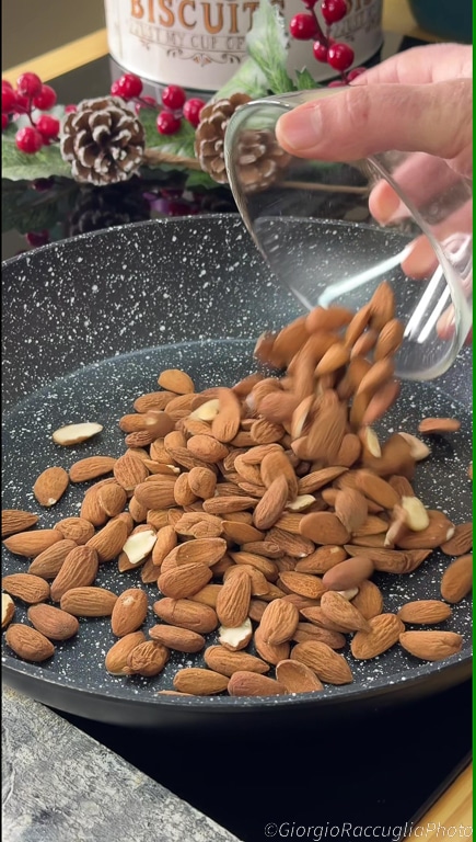 • To prepare the praline almonds, first transfer the almonds to a non-stick pan,