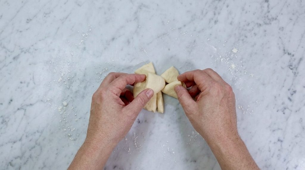 Gently fold the two outer flaps toward the center so they meet over the middle section. Now take the central strip (the knot) and place it over the two wings. Press lightly with your fingertips to seal the junction so the bow won’t open while it puffs up in the oven.