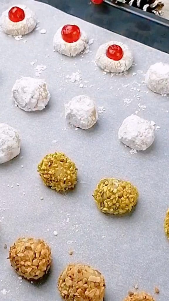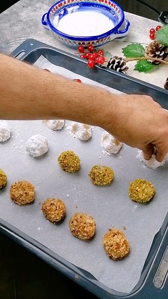 • Pass 12 balls in powdered sugar, and the remaining ones in pistachio crumbs and almond crumbs.