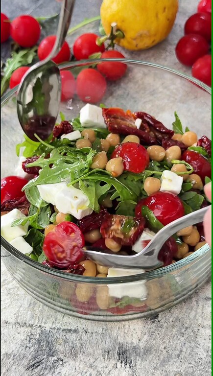 The summer salad with arugula, chickpeas, and feta is a fresh, light recipe perfect for quick lunches or outdoor dinners during the warm months. Rich in flavor thanks to cherry tomatoes, sun-dried tomatoes, and fresh basil, it’s a dish that combines taste and health in every bite. The addition of feta gives it a creamy and savory touch, while lemon juice and extra virgin olive oil enhance all the ingredients with simplicity. This cold summer salad is also ideal for vegetarians or those seeking a balanced one-dish meal, thanks to the chickpeas that provide plant-based proteins. It can be prepared in minutes and easily personalized with seasonal vegetables or other legumes. An excellent solution for those who want to eat healthily without sacrificing taste, perfect to bring to the office or the beach.