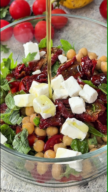 The summer salad with arugula, chickpeas, and feta can be stored in the refrigerator for up to 1 day, well-sealed in an airtight container. It’s recommended to dress it at the last moment with oil and lemon juice to keep the arugula leaves fresh. If prepared in advance for an outdoor lunch, keep it in the fridge until ready to eat and mix well before serving.