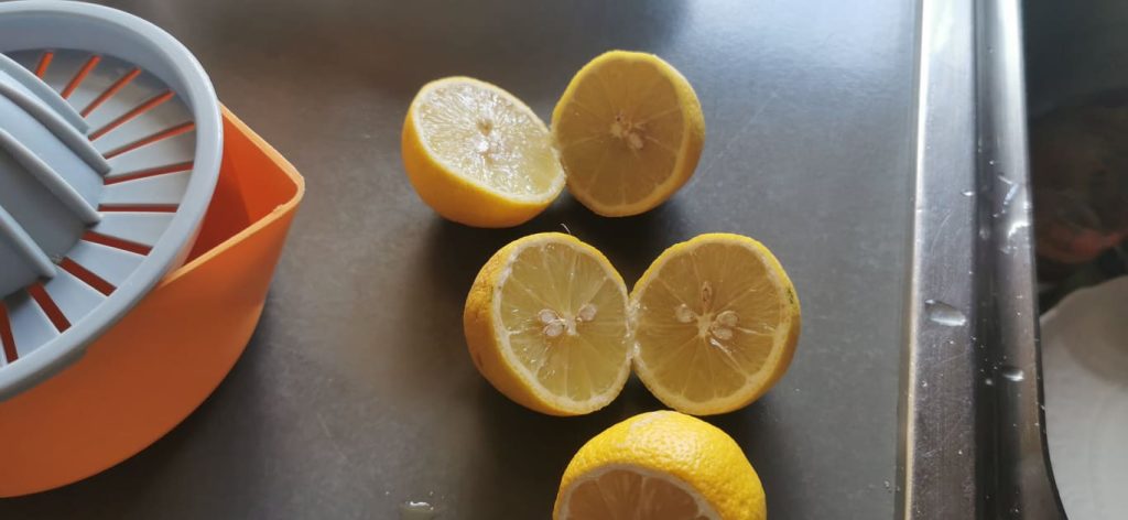 • Squeeze and strain the lemon juice.