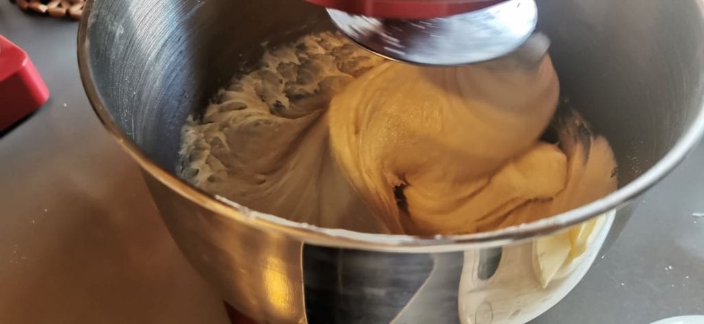 Mix with the paddle attachment for about 5 minutes. You should only combine the ingredients well. Change the paddle attachment and insert the hook.