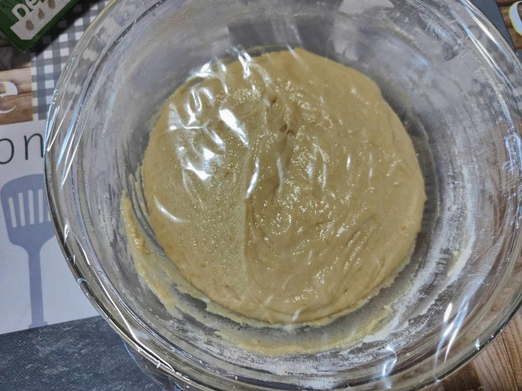 Mix and add 90ml of whole milk at room temperature, mix with a wooden spoon, cover with cling film, and let rise in a warm place for about 30 minutes.