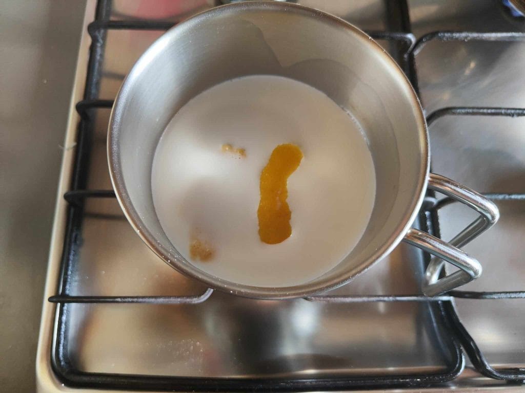 Pour the milk into a small pot, add the zest of half a lemon, and heat it until it reaches 95°F, dissolving the sugar while stirring.