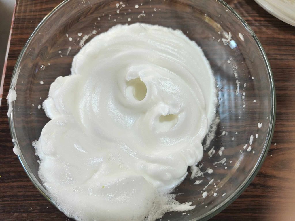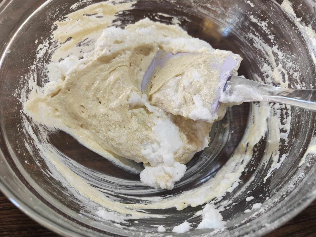 Gently fold in the previously whipped egg whites, followed by the tapioca starch.