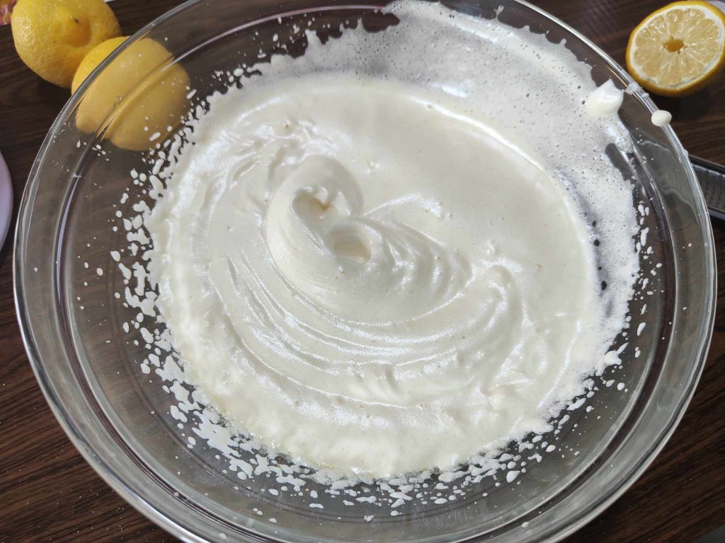 Separately, work the 4 yolks with 150g erythritol, the zest of an organic lemon, and a sachet of vanillin.