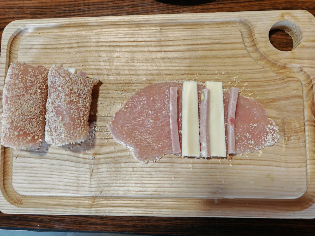 Take the chicken breast slices, dip them in oil, and breadcrumbs, place mortadella and cheese pieces in the center of each one (In my case I had a nice slice of mortadella which I cut into strips and as cheese, I had some Gruyere, and I must say it was a perfect combination) you can fill them as you prefer, roll up.