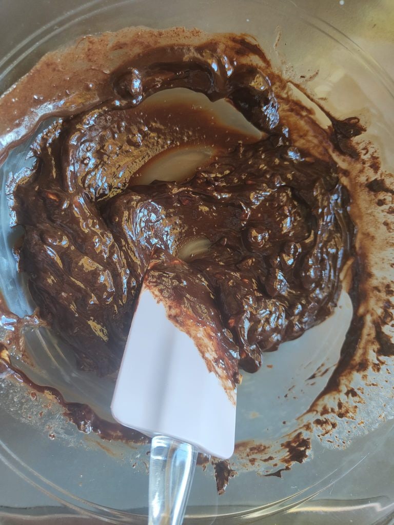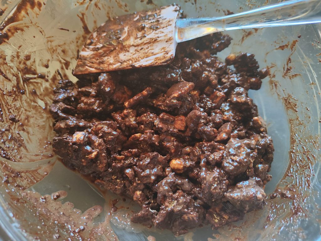 In a fairly large bowl, combine the melted chocolate, oil, grated coconut, plant-based milk, and finally the crumbled biscuits. Mix well.