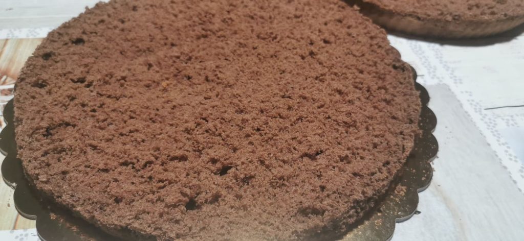 • When the base has cooled, cut it in half horizontally and soak the bottom layer with a few tablespoons of milk.