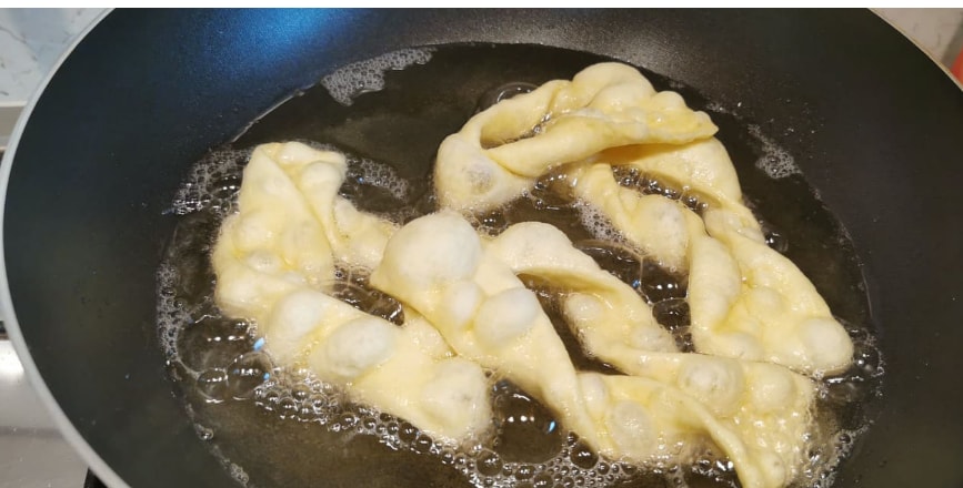 The oil is ready at a temperature of 338°F, to know when the oil is ready, test with a piece of dough.