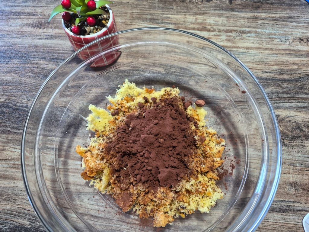 In a large bowl, mix the biscuit powder with the 2 oz of unsweetened cocoa. Ensure the color is homogeneous: it will be the chromatic base of your pinecone.