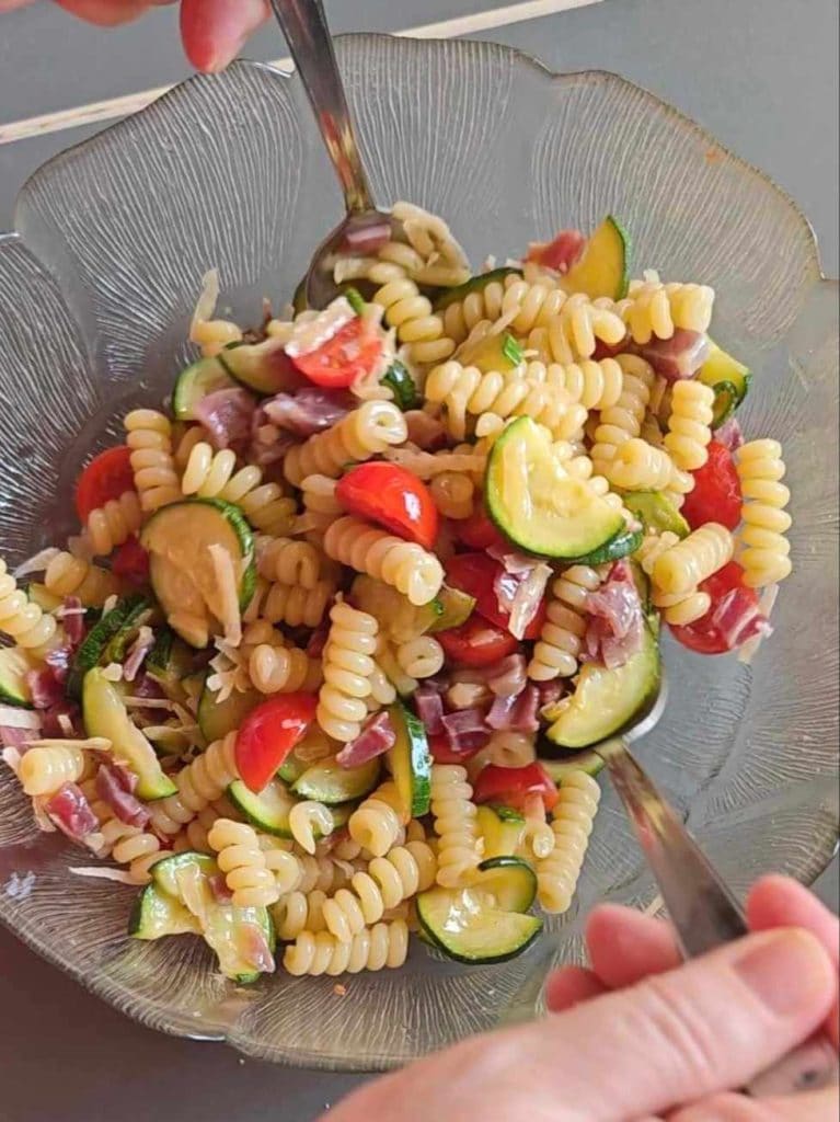 Cold pasta with zucchini and speck can be made even more appetizing with the addition of cherry tomatoes and cheese flakes, making your pasta even crunchier and more exciting.