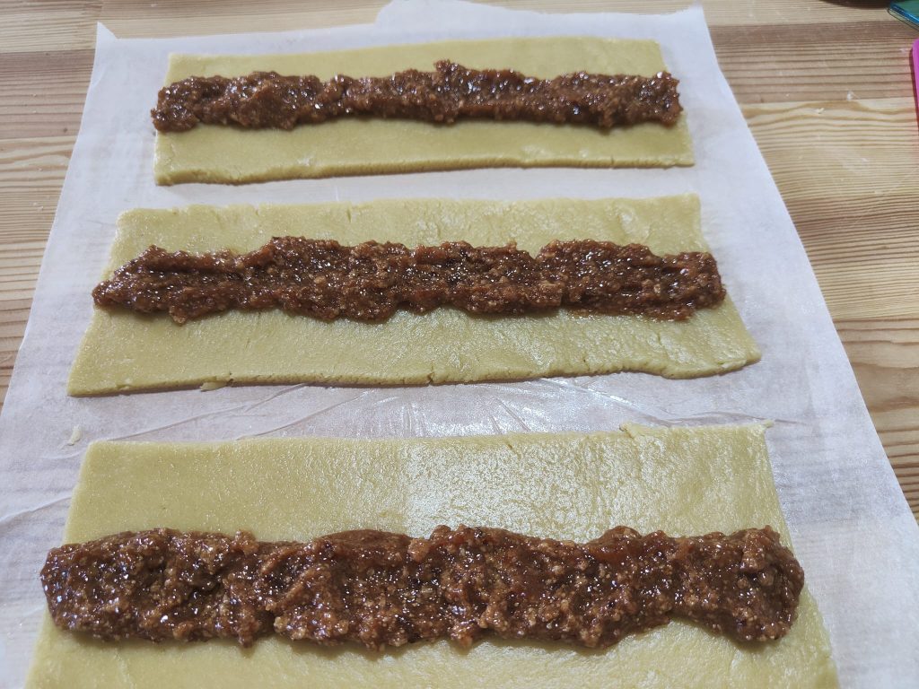 Now place a strip of filling in the center of each rectangle, then fold the shortcrust pastry edges over, place them on a baking sheet with the seam side down, and freeze for about 20 minutes.
