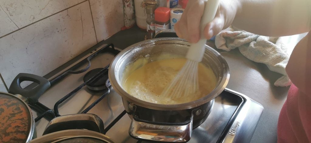 • In a separate small pan, mix the eggs with the sugar. (Whole eggs, both yolk and white).