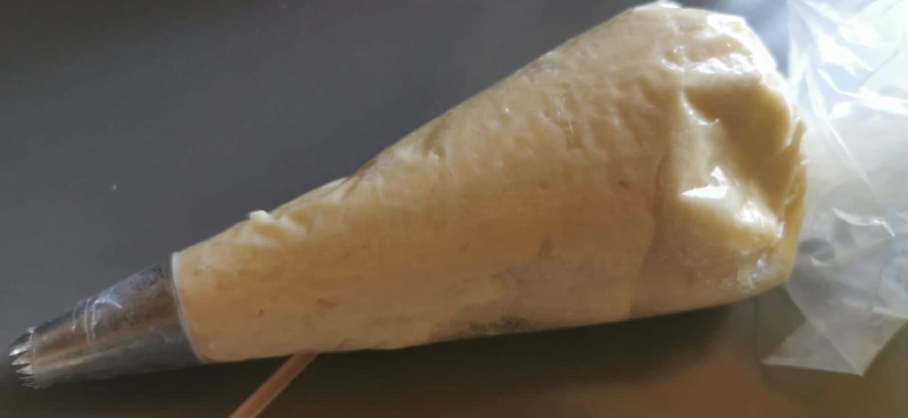 Now incorporate the whole egg and the lightly beaten yolk.Mix everything well to form a smooth and homogeneous mixture. Put the mixture in a piping bag with a star tip.