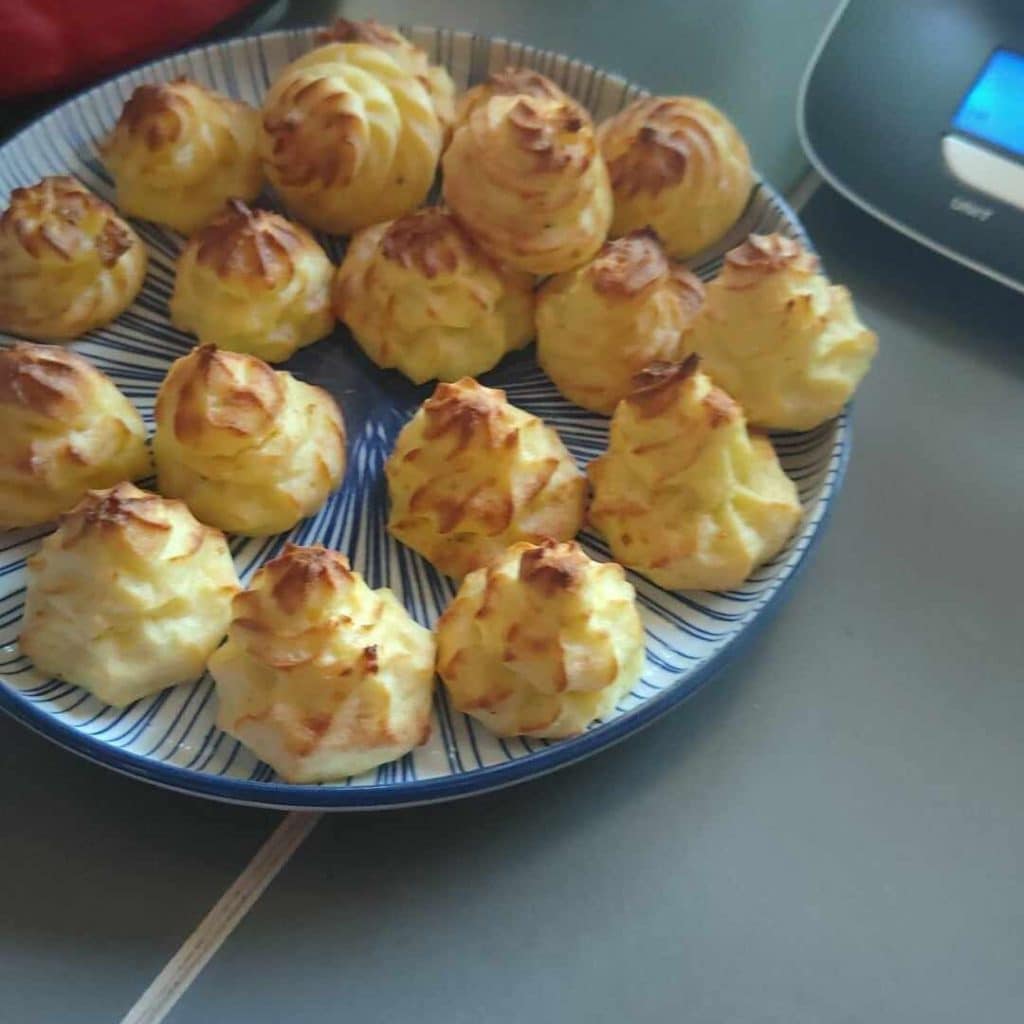 We form circles of about 2.5 inches of dough that we finish with a tuft, well spaced from each other, we will get duchess potatoes that will become the lids of our baskets.