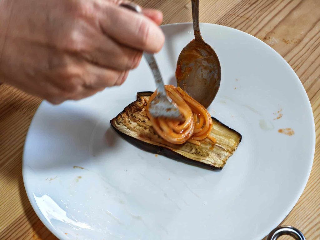 The eggplant rolls filled with spaghetti can be prepared in advance, stored in the fridge, and gratinated only when needed.