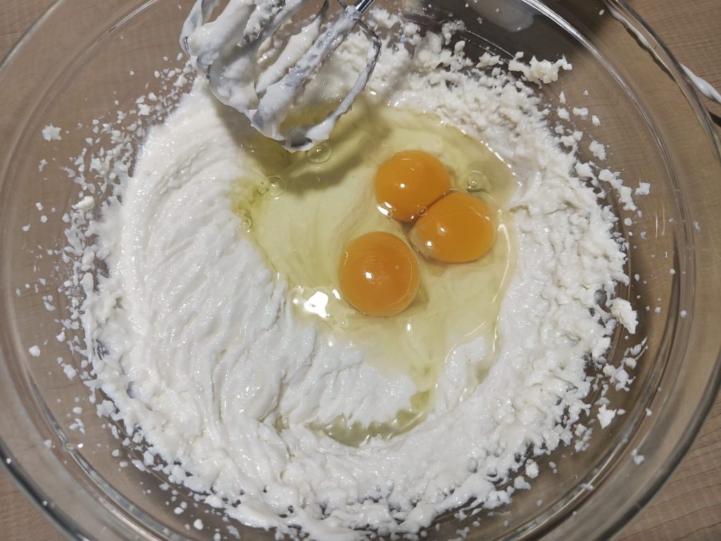 Drain the ricotta and place it in a bowl, add the eggs and mix everything with the beater until well blended.