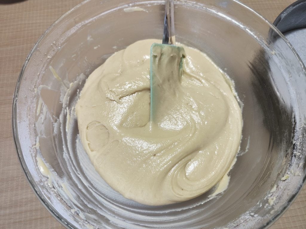 When the mixture is well combined, transfer it all into the cake pan and bake (at 356°F) for 35 minutes.