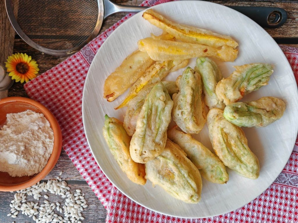 Prepared with a simple batter of cold water, flour, and salt and fried in peanut oil, which keeps the frying light and crispy and whose delicate smell does not cover that of the flowers.