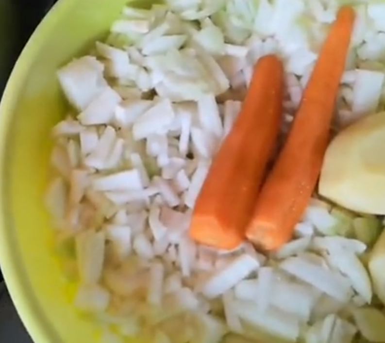 Add the finely sliced onions, stir and let them flavor, incorporating the two carrots (if you want, cut them into pieces, otherwise leave them whole).