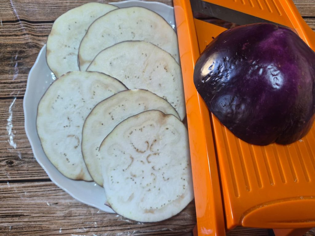 With the mandoline: Set the blade to about 0.16 in (approximately 5/32 in). Run the eggplant firmly to get uniform slices.