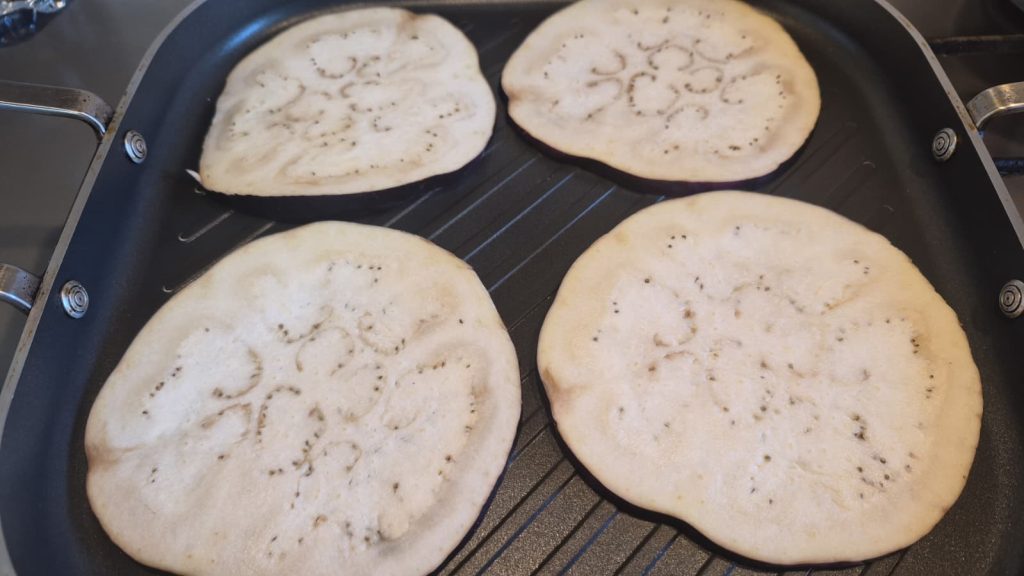 If you have many guests and want to grill all the eggplants at once, the oven is your best ally. Compared to the grill pan, oven-grilled eggplants tend to stay more even and less “charred,” which makes them very elegant to look at.