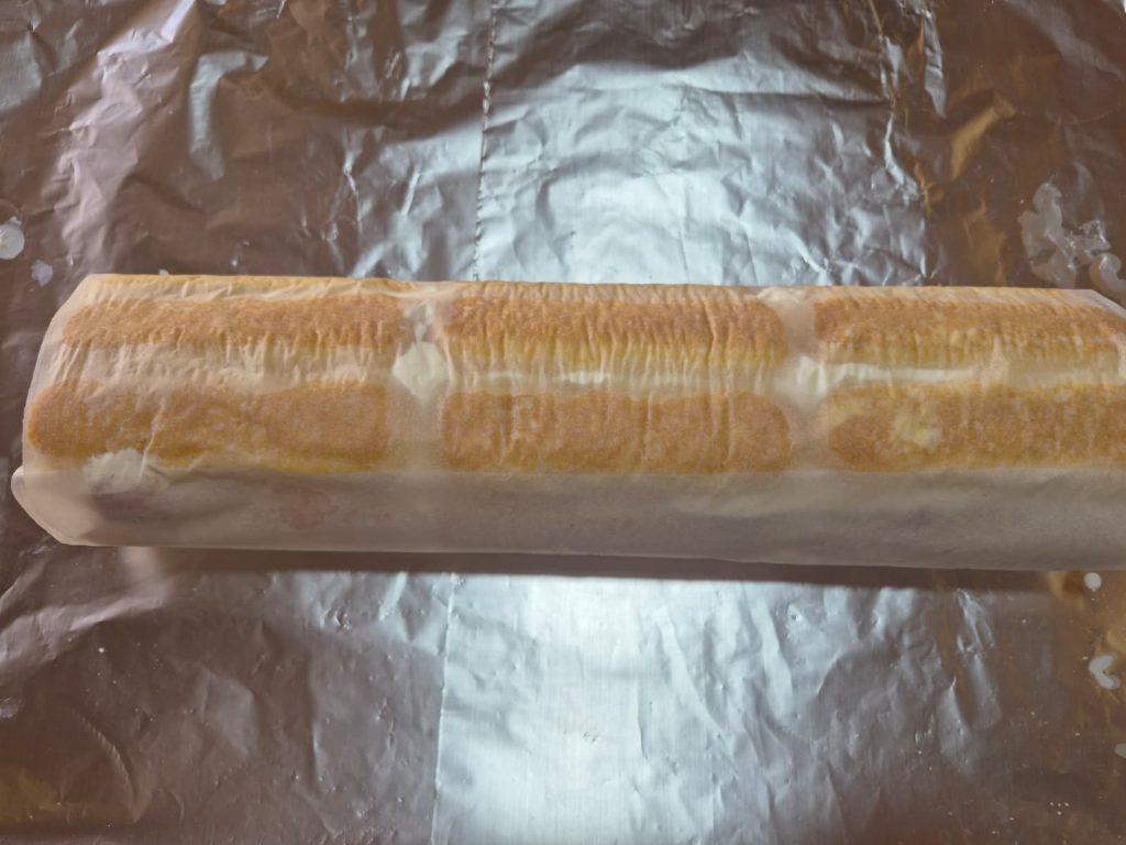 Ladyfingers are like sponges. Don’t soak them too long in the milk: it should be a quick in-and-out movement. If they get too wet, the roll will be hard to handle and will lose shape despite the aluminum foil.