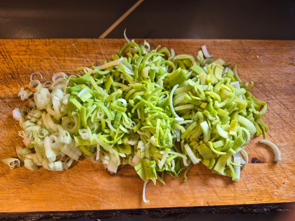 Thinly slice the leek and let it soften in a pan with a drizzle of oil.