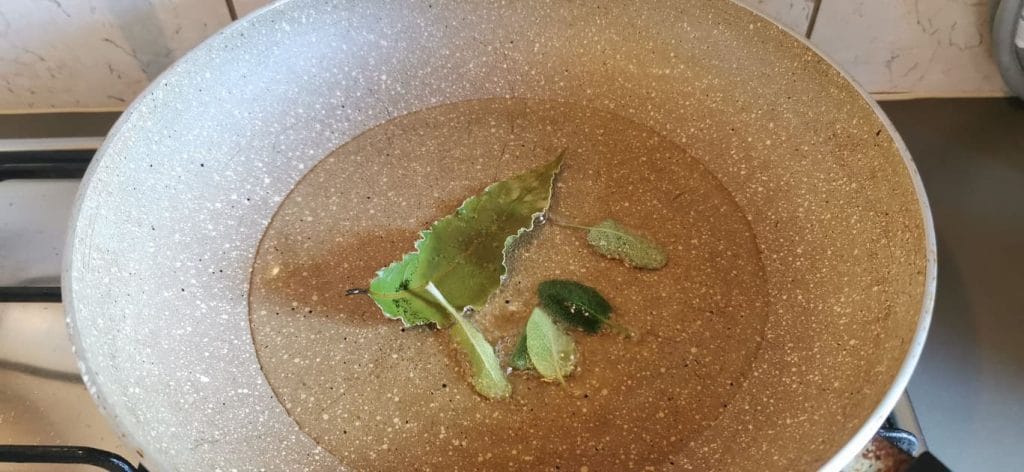 In a non-stick pan, pour some oil, add sage leaves and 1 bay leaf.