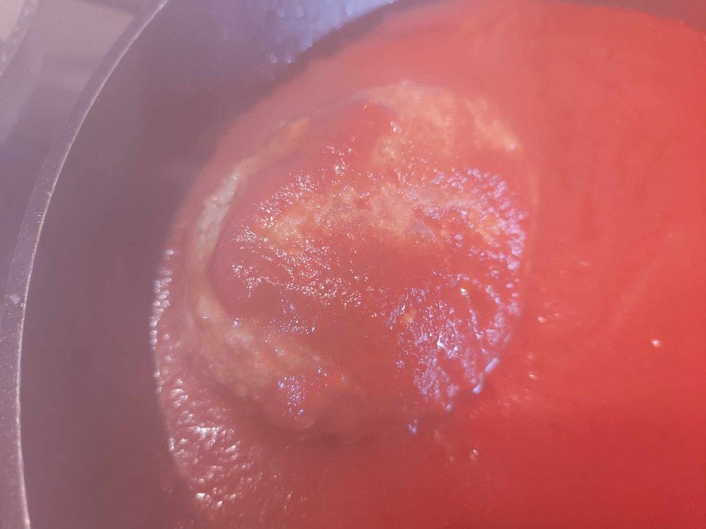 When the tomato sauce starts to boil, add the meatballs, cover the pot, and let them cook over medium heat for 7-8 minutes.