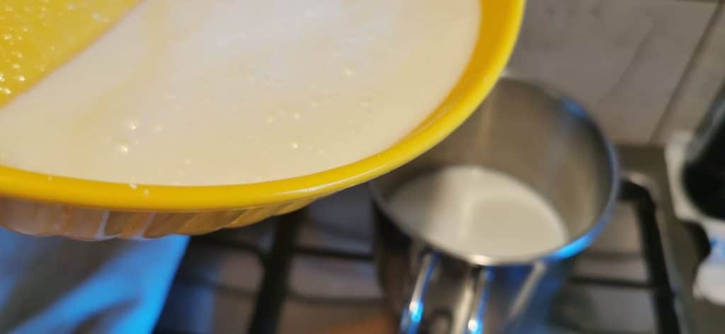 Pour the 0.4 cups of cold milk stirring well with the whisk to avoid lumps.