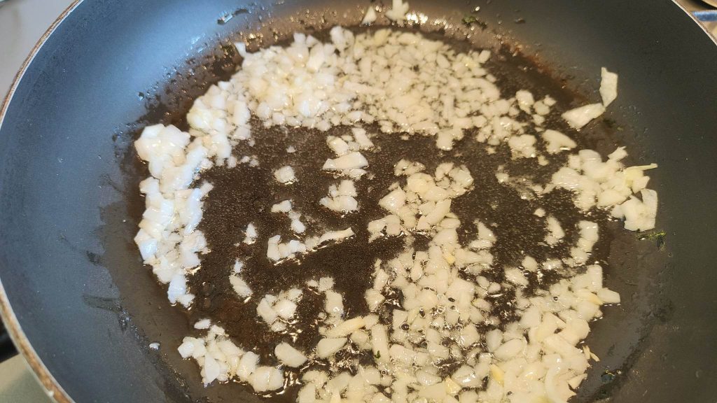 In a pan, put the extra virgin olive oil, add the onion and let it brown. Add the fava beans and let them season for a few minutes.