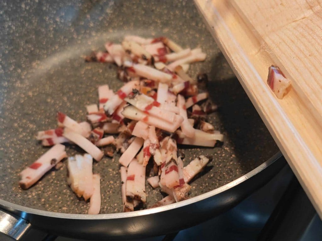 Fry it in a pan without adding any fats until it is crispy on the outside but soft inside. Then drain it from its fat and set both aside to cool.