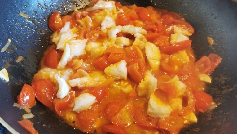 Cod, as many of you may know, is simply salted preserved cod. Once desalted, the fillets are tender but meaty, perfect for enriching this sauce made with fresh cherry tomatoes.
