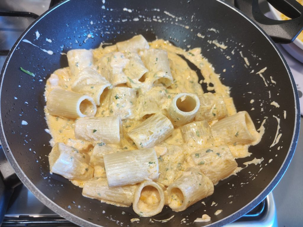 Pour the obtained cream into the same pan in which the salmon was cooked, while the pasta cooks, add a little cooking water to soften the cream.