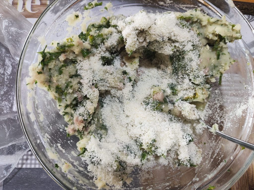 In a bowl where we have the mashed potatoes, add the sausages cut into small pieces, the chopped friarielli, the sliced provola, the grated cheese, and finally the eggs.