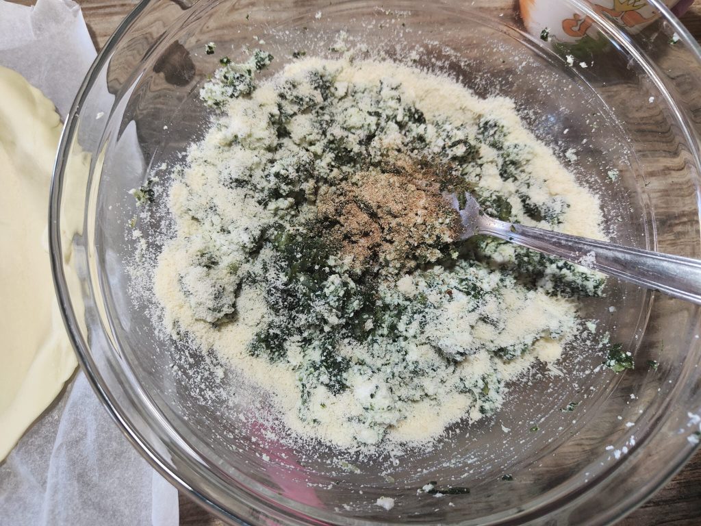 • In a bowl, mix the well-drained ricotta with the chopped spinach.