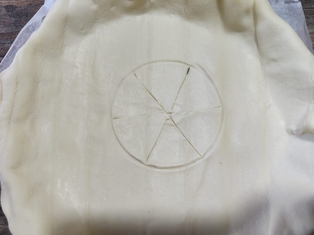 • Roll out the puff pastry on its parchment paper. Place an inverted bowl in the center and press it lightly to mark the central disk (it will serve as a guide).
