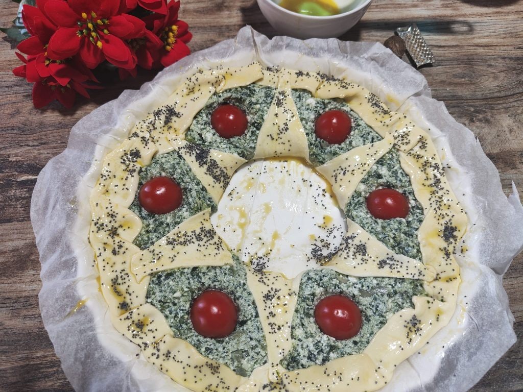 Puff Pastry Crown with Spinach and Ricotta. An easy-to-prepare, delicious, and cheerful appetizer, perfect for adorning tables during the Christmas holiday period but not only.