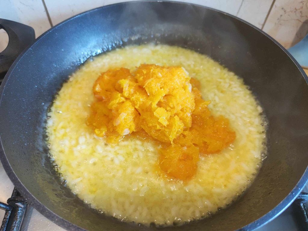 Indeed, pumpkin, with its delicate and slightly sweet flavor, pairs perfectly with Taleggio, which is a soft cheese with a fairly strong aroma and flavor that also adds creaminess to the risotto; the final touch is given by rosemary.