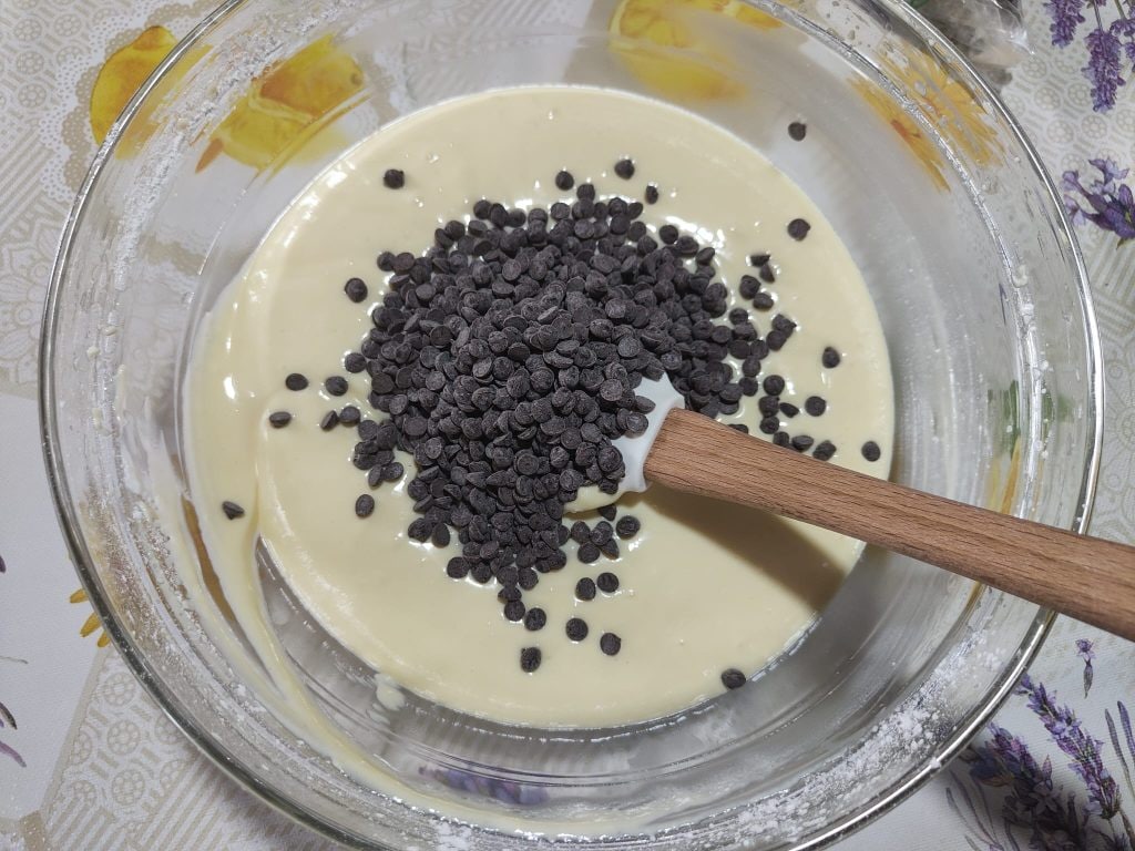 Before starting the recipe preparation, put the chocolate chips in the freezer for at least 30 minutes, so that when you bake the cake they do not melt immediately.