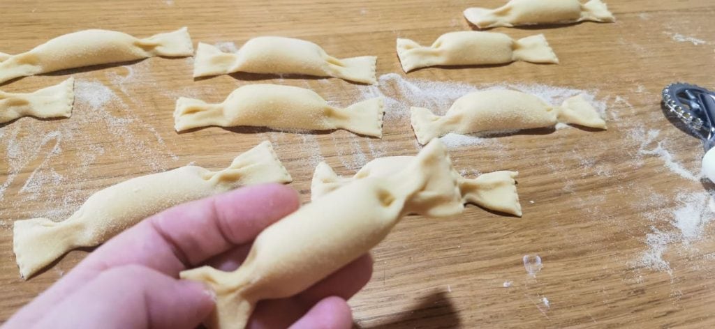 Squeeze the two ends. (Then with the tips of your fingers, shape your stuffed pasta candies).