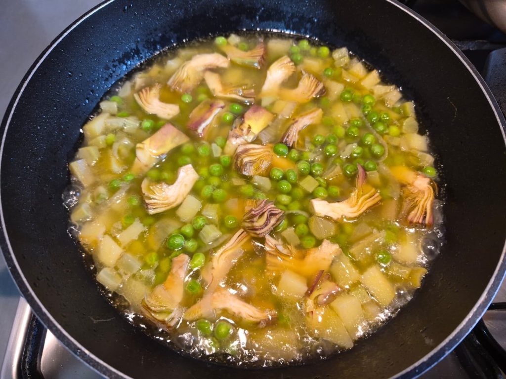 Add the artichokes (drained from the water and lemon) and potato cubes. Sauté for a few minutes. Meanwhile, put the water for the macaroni on the stove.